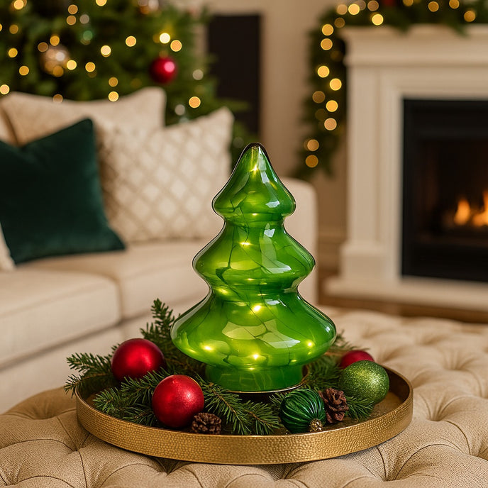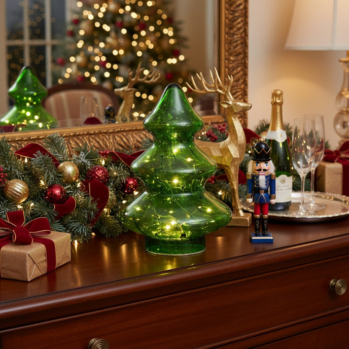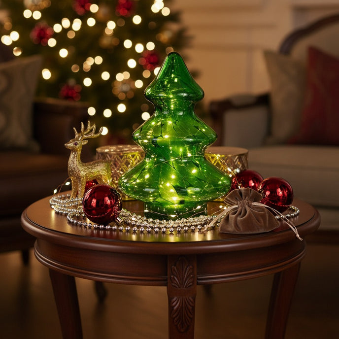 Bradul este realizat din sticlă de înaltă calitate și inserții luminoase LED care creează o atmosferă caldă și festivă. Fie că îl așezi pe o comodă, o masă decorativă sau lângă bradul principal, va deveni instantaneu un punct de atracție al decorului tău de iarnă.