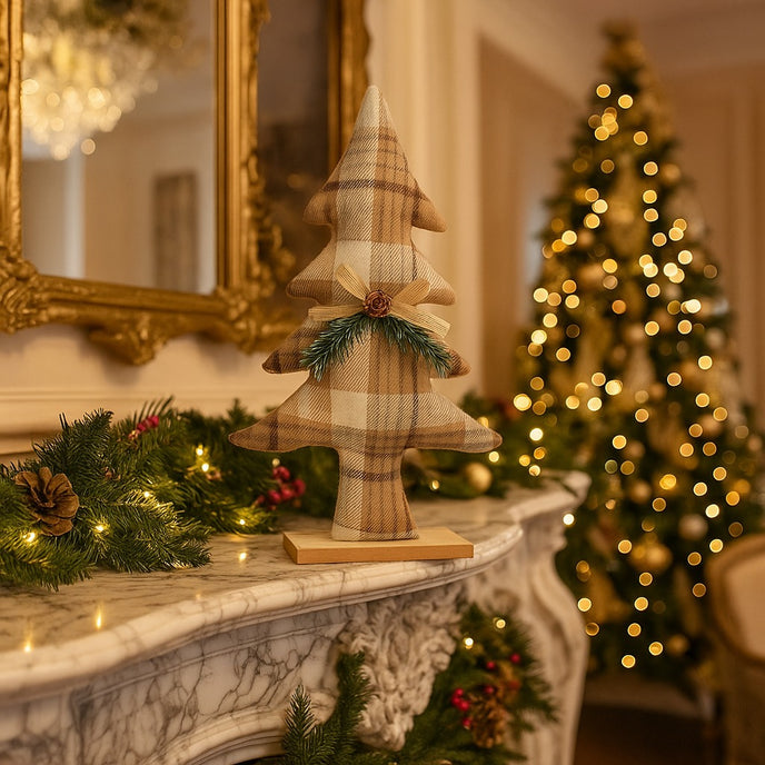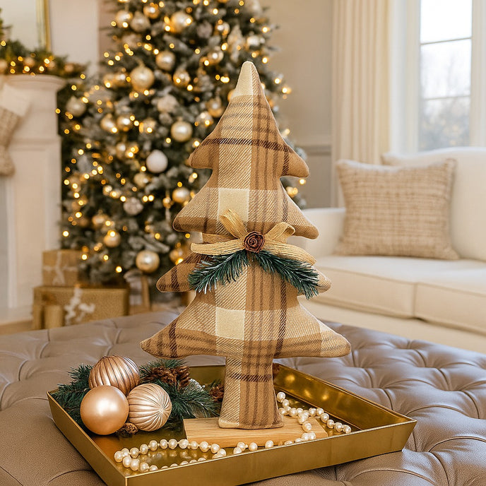 Acest brad decorativ textil în carouri bej este o alegere excelentă pentru un cadou de Crăciun elegant, potrivit pentru iubitorii de decoruri naturale și autentice.