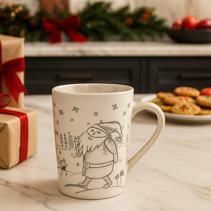 Această cană albă cu Moș Crăciun aduce zâmbetul și magia sărbătorilor în fiecare dimineață. Cu un design minimalist realizat în nuanțe gri fine, reprezintă perfect spiritul iernii – calm, nostalgic și plin de căldură.