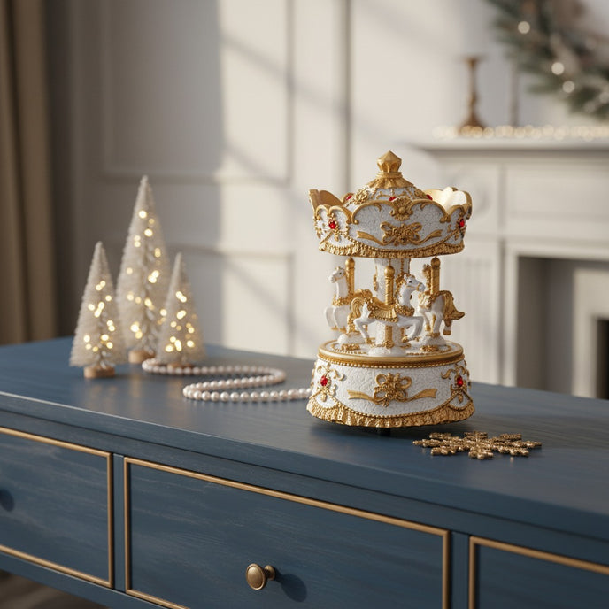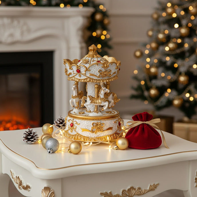 Caruselul se rotește delicat în ritmul unei melodii festive, creând o atmosferă caldă și plină de emoție. Este perfect pentru a fi expus pe o comodă, o masă festivă sau lângă bradul de Crăciun, aducând un strop de magie și nostalgie de sărbătoare.
