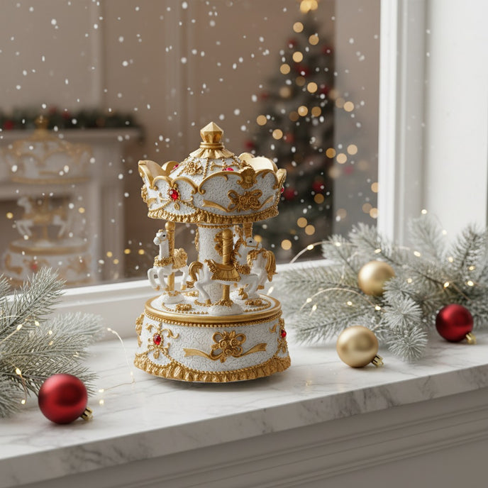 Descoperă farmecul unui carusel muzical decorativ alb-auriu, inspirat din eleganța clasică a secolului XIX. Confecționat cu detalii aurii strălucitoare, figurine de cai grațioși și accente roșii decorative, acest carusel este o adevărată bijuterie de Crăciun ce aduce un aer regal oricărui decor.