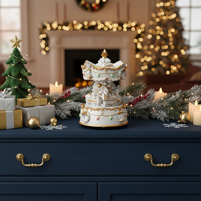 Acest carusel muzical rotativ de Crăciun transformă decorul tău într-o adevărată poveste de iarnă. Realizat în nuanțe elegante de alb și auriu, cu brad împodobit, trenuleț și Moș Crăciun, caruselul se rotește ușor în timp ce redă o melodie festivă delicată, aducând un farmec nostalgic și o atmosferă caldă în orice încăpere.