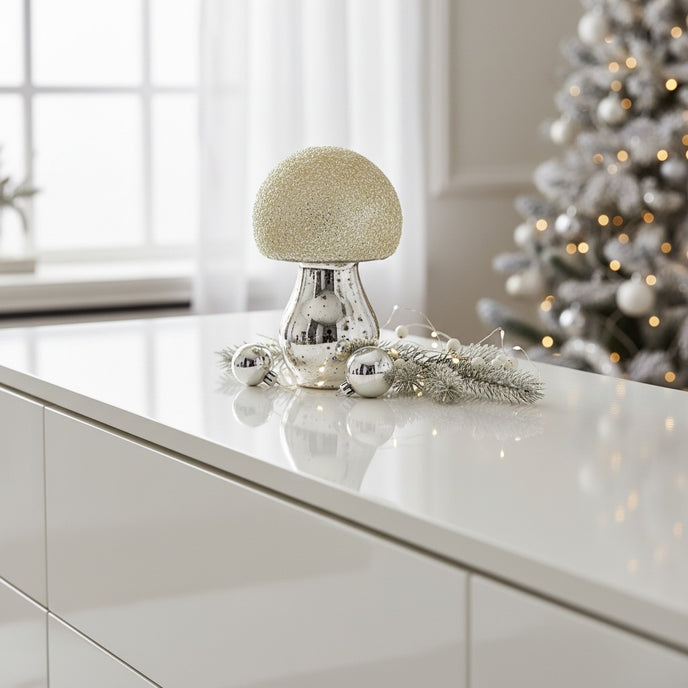 Alege această ciupercă decorativă argintie cu mărgele pentru a adăuga o notă sofisticată și strălucitoare casei tale.