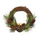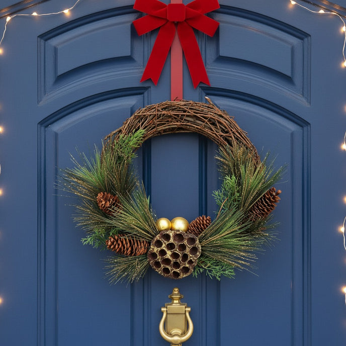 Creează un decor plin de farmec și eleganță cu această coroniță decorativă de Crăciun cu conuri și accente aurii, perfectă pentru a aduce atmosfera caldă a sărbătorilor în casa ta.