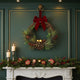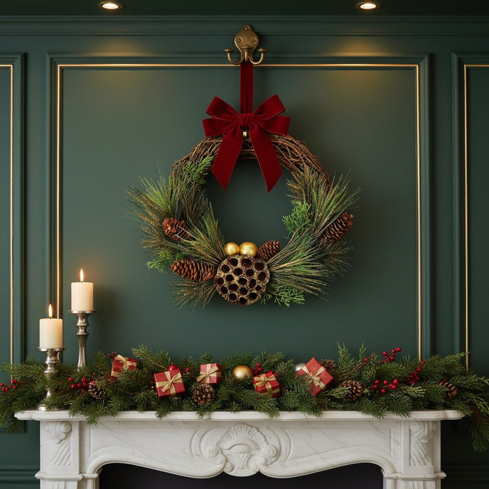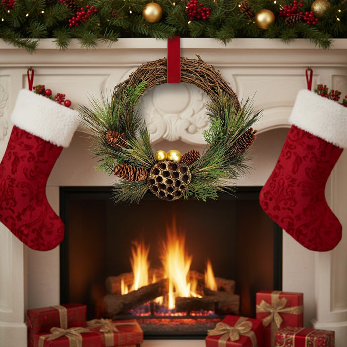 Cu o bază realizată din crenguțe naturale, decorată cu ramuri verzi de brad, conuri, globuri aurii și detalii strălucitoare, această coroniță emană un aer rustic și festiv în același timp. Este ideală pentru a fi agățată pe ușa de la intrare, așezată pe masă ca aranjament central sau inclusă într-un decor de șemineu.