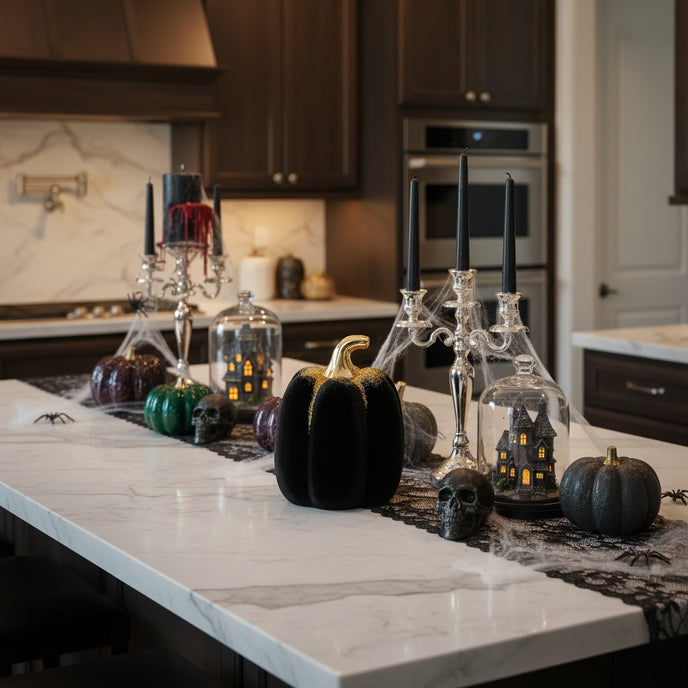 Acest dovleac decorativ negru din catifea este completat de o codiță aurie și accente strălucitoare cu sclipici. Este alegerea perfectă pentru un decor festiv elegant, potrivit atât pentru Halloween, cât și pentru aranjamente de toamnă.