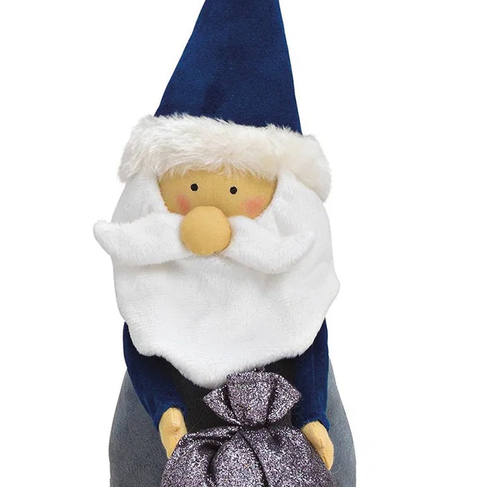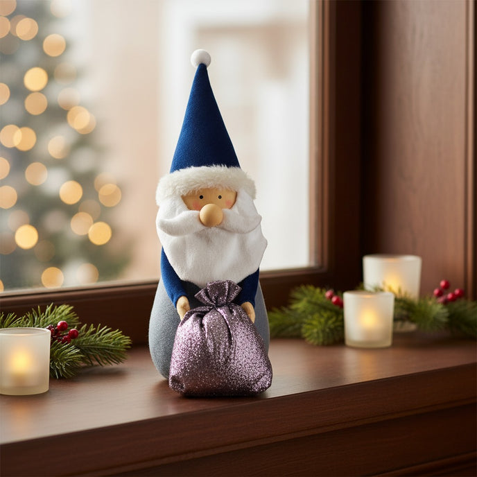 Adaugă un accent sofisticat decorului tău de iarnă cu acestă figurină Moș Crăciun cu sac de cadouri, o figurină textilă plină de farmec și rafinament. Cu o căciulă conică albastră, barbă albă moale și un sac sclipitor argintiu în mâini, acest Moș transmite eleganță și calmul sărbătorilor de iarnă.