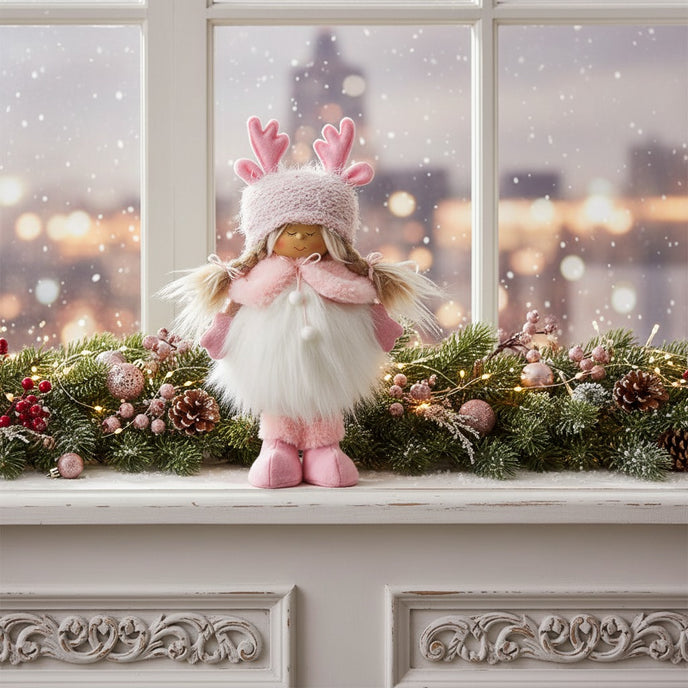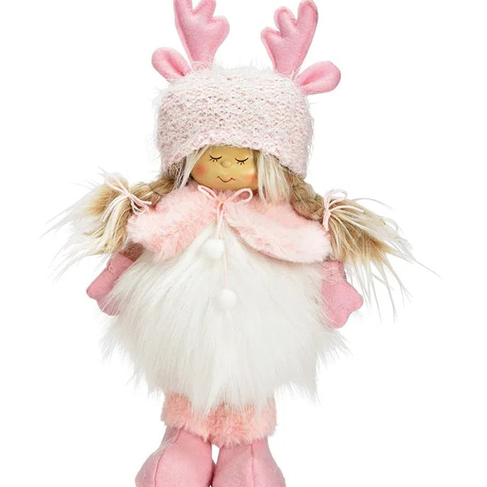Transformă-ți casa într-un colț de poveste cu această figurină decorativă roz fetiță cu blăniță, o decorațiune textilă rafinată, inspirată din stilul scandinav. Realizată cu atenție la detalii, fetița poartă o căciulă tricotată cu coarne de ren, are păr împletit, blăniță albă pufoasă și accente delicate de roz, aducând un aer cald și elegant în orice decor de Crăciun.