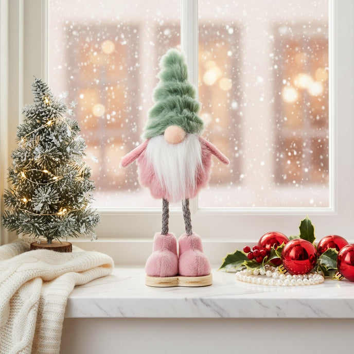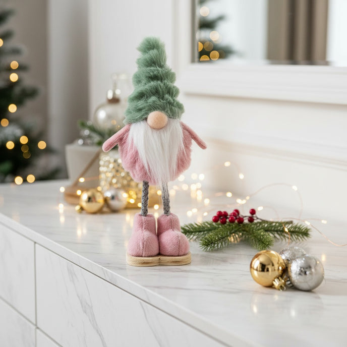 Acest gnom decorativ de Crăciun aduce cu el bucuria și căldura sărbătorilor, inspirat din tradițiile scandinave. Cu pălăria verde spiralată, haine roz-praf și cizmulițe pufoase, este o figurină adorabilă care însuflețește orice decor de iarnă.