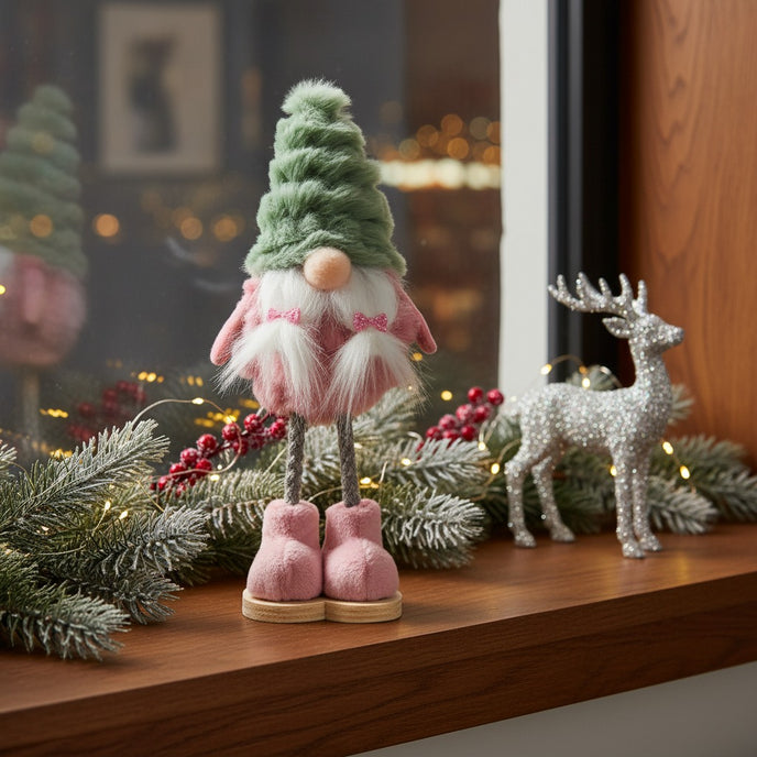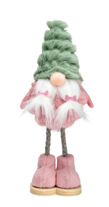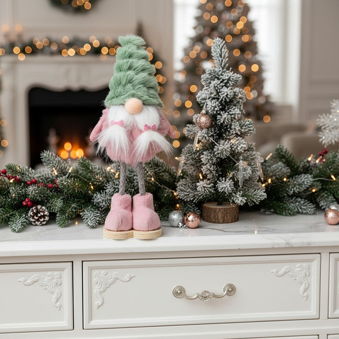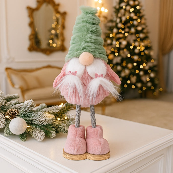 Aceast gnom decorativ de Crăciun este simbolul farmecului și al bucuriei de iarnă. Cu pălărie verde moale, hăinuță roz pufoasă și două fundițe sclipitoare, este un decor deosebit ce aduce o notă feminină și veselă în casa ta.