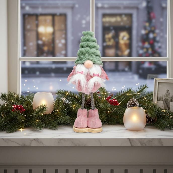 Realizat din materiale textile moi și de calitate, cu o bază stabilă din lemn, aceast gnom îmbină stilul tradițional cu un aer modern. Culorile pastel – verde mentă și roz pudră – sunt ideale pentru decorurile rafinate de iarnă.