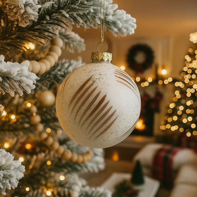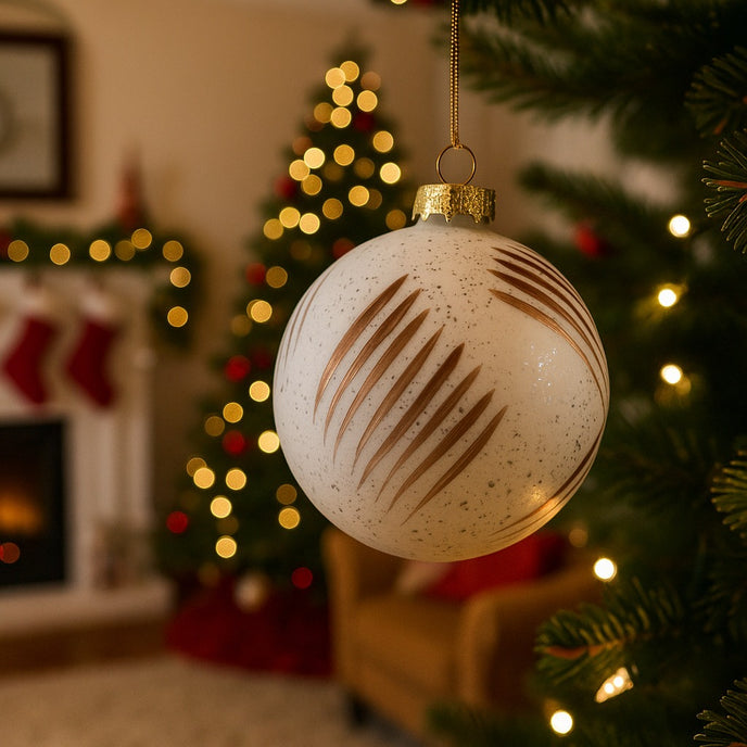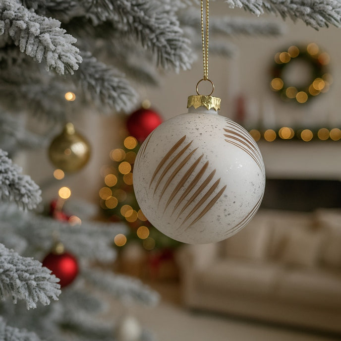 Transformă bradul tău într-un simbol al Crăciunului autentic cu acest glob decorativ din sticlă, alb cu detalii aurii, o piesă elegantă ce combină farmecul clasic cu un design rafinat. Finisajul mat, stropit cu accente albe delicate, oferă un efect de zăpadă ușor, iar liniile aurii adaugă o notă de strălucire subtilă, perfect echilibrată.