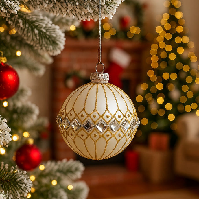Adaugă o notă sofisticată decorului tău festiv cu acest glob decorativ alb din sticlă, cu detalii argintii, o piesă elegantă care reflectă perfect magia Crăciunului. Cu o formă clasică și o textură bogată, globul combină tonurile calde de alb cu accentele argintii strălucitoare, creând un contrast rafinat și festiv.