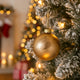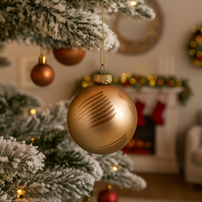 Transformă bradul tău într-un simbol al Crăciunului autentic cu acest glob decorativ din sticlă, auriu, o piesă elegantă ce combină farmecul clasic cu un design rafinat. Finisajul mat, stropit cu accente albe delicate, oferă un efect de zăpadă ușor, iar liniile aurii adaugă o notă de strălucire subtilă, perfect echilibrată.