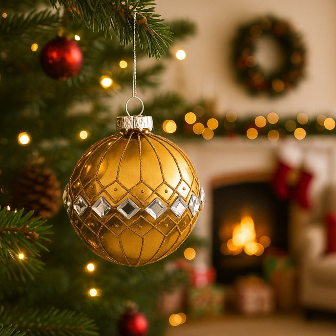 Adaugă o notă sofisticată decorului tău festiv cu acest glob decorativ auriu din sticlă, cu detalii argintii, o piesă elegantă care reflectă perfect magia Crăciunului. Cu o formă clasică și o textură bogată, globul combină tonurile calde de auriu cu accentele argintii strălucitoare, creând un contrast rafinat și festiv.