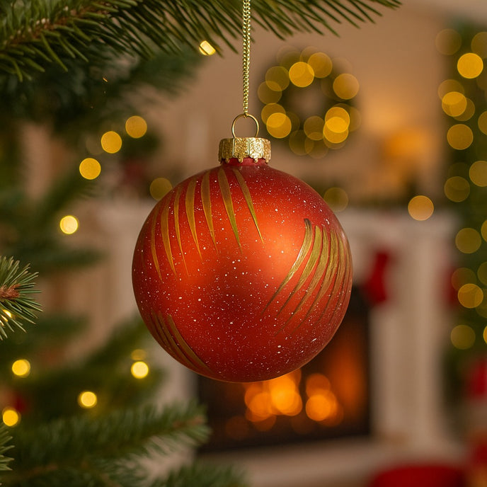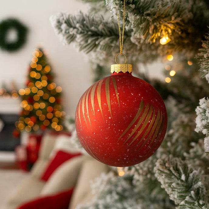 Transformă bradul tău într-un simbol al Crăciunului autentic cu acest glob decorativ din sticlă, roșu cu detalii aurii, o piesă elegantă ce combină farmecul clasic cu un design rafinat. Finisajul mat, stropit cu accente albe delicate, oferă un efect de zăpadă ușor, iar liniile aurii adaugă o notă de strălucire subtilă, perfect echilibrată.