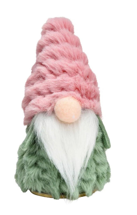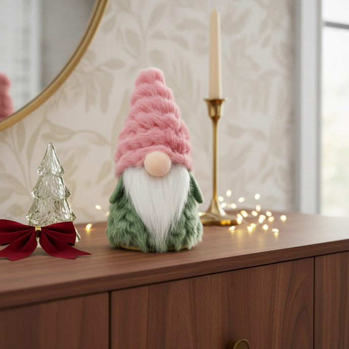 Realizat din materiale moi și plăcute la atingere, gnomul impresionează prin textura sa pufoasă și culorile pastelate, ideale pentru un decor modern și cald de iarnă. Căciula roz din material catifelat și haina verde creează un contrast elegant.