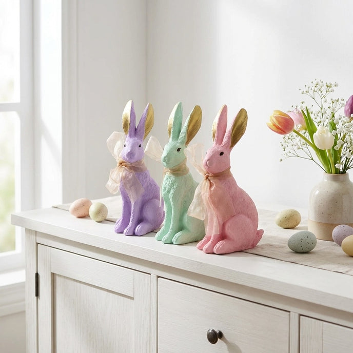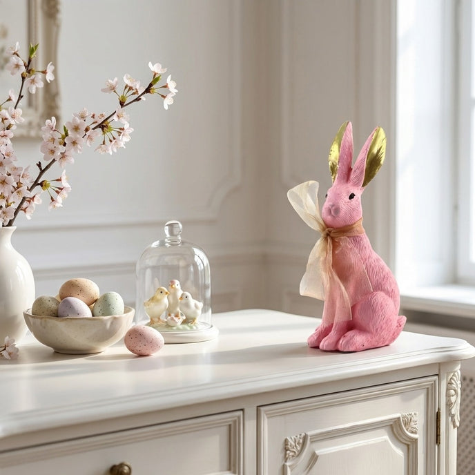 Combinația dintre corpul roz și interiorul urechilor auriu metalizat oferă un aspect regal, ideal pentru decoruri interioare elegante. Funda generoasă din organza aurie, legată delicat la gât, adaugă un strat de textură și finețe întregului design. Suprafața figurinei prezintă detalii fine ce imită textura blăniței, oferind profunzime și un aspect artizanal de înaltă calitate. Iepurașul este surprins într-o poziție așezată, calmă, fiind perfect pentru a trona în centrul mesei de Paște sau pe o consolă decorativă.