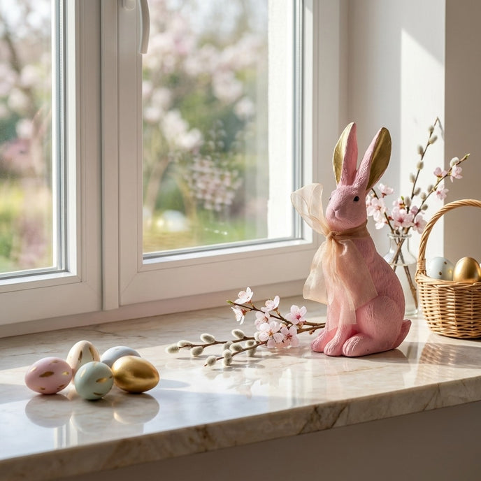 Adaugă o notă de lux și distincție decorului tău festiv! Iepurașul decorativ din Colecția de Paște Ornament24 este o piesă statement care îmbină perfect delicatețea nuanței de roz cu strălucirea prețioasă a aurului, fiind creat pentru a impresiona.