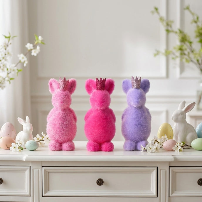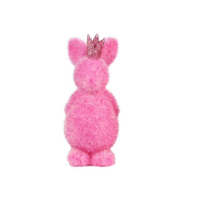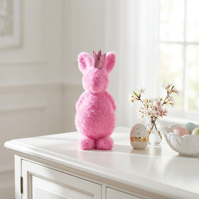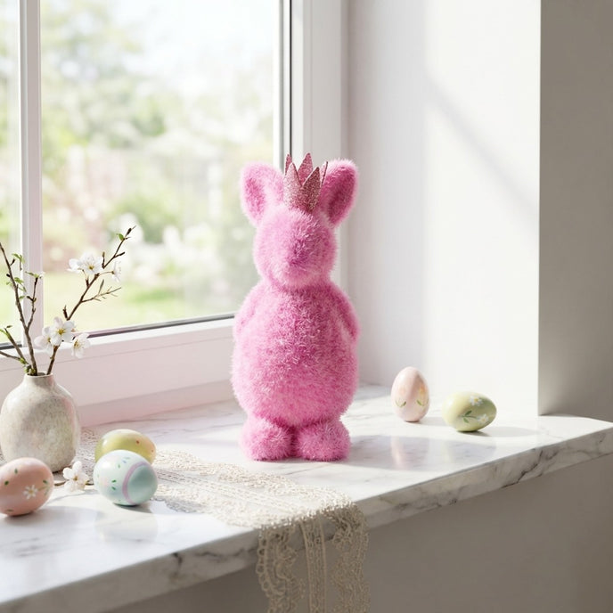 Realizat dintr-un material ce imită o blăniță rară și ciufulită, acest iepuraș oferă un aspect vizual extrem de simpatic și cald. Coronița roz cu sclipici, așezată între urechi, transformă figurina într-un personaj regal, perfect pentru a aduce un zâmbet pe chipul oricui. Nuanța de roz aduce o pată de culoare necesară oricărui aranjament de primăvară, ieșind în evidență în orice colț al casei. Silueta sa rotunjită și bine echilibrată îl face ușor de plasat pe masa de Paște, pe pervazul ferestrei sau în camera celor mici.