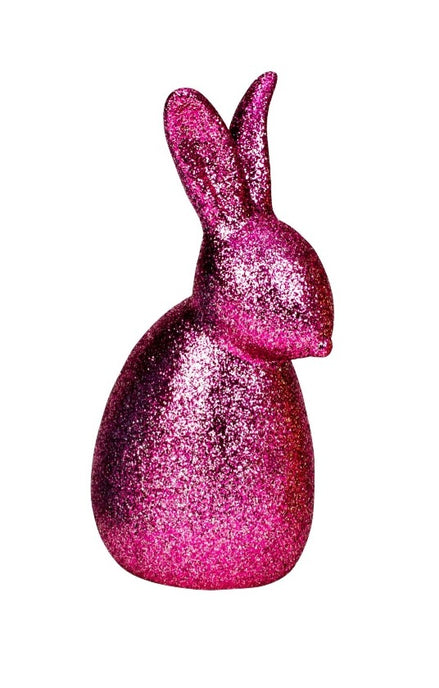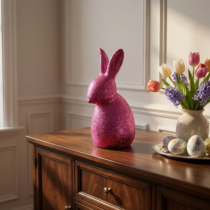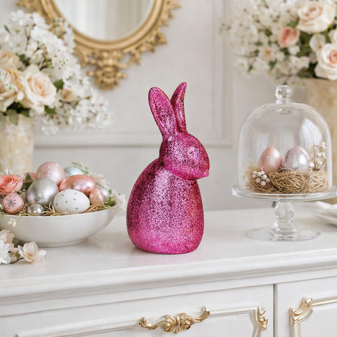 Întreaga suprafață a figurinei este acoperită cu un sclipici fin roz, care oferă reflexii spectaculoase sub orice sursă de lumină. Designul modern, fără trăsături faciale detaliate, pune accentul pe formă și culoare, integrându-se perfect în interioarele contemporane. Nuanța intensă de roz aduce o pată de culoare proaspătă, fiind o alternativă îndrăzneață la decorațiunile tradiționale în culori pastelate. Cu o înălțime de 23cm, este accesoriul ideal pentru a completa un centru de masă, pentru a înfrumuseța un raft de bibliotecă sau pentru a fi oferit ca simbol al primăverii.