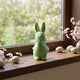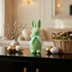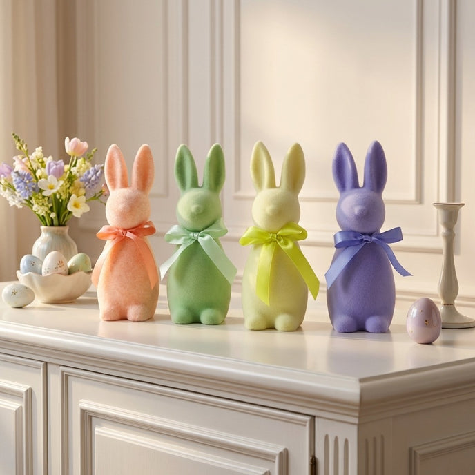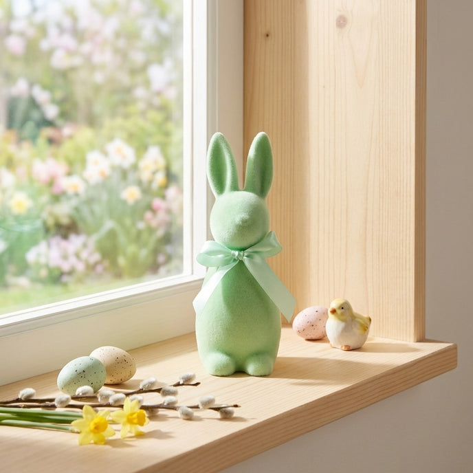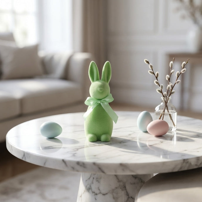 Învelișul catifelat oferă figurinei o textură moale la atingere și un aspect mat, care difuzează lumina într-un mod plăcut și cald. Nuanța de verde este extrem de actuală, aducând un suflu proaspăt și optimist aranjamentelor tale de sărbătoare. Funda din satin, perfect asortată culorii corpului, adaugă un plus de rafinament și transformă figurina într-un obiect decorativ complet. Silueta zveltă și simplificată face ca acest iepuraș să poată fi integrat cu ușurință în diverse stiluri de interior, de la modern la clasic-elegant.