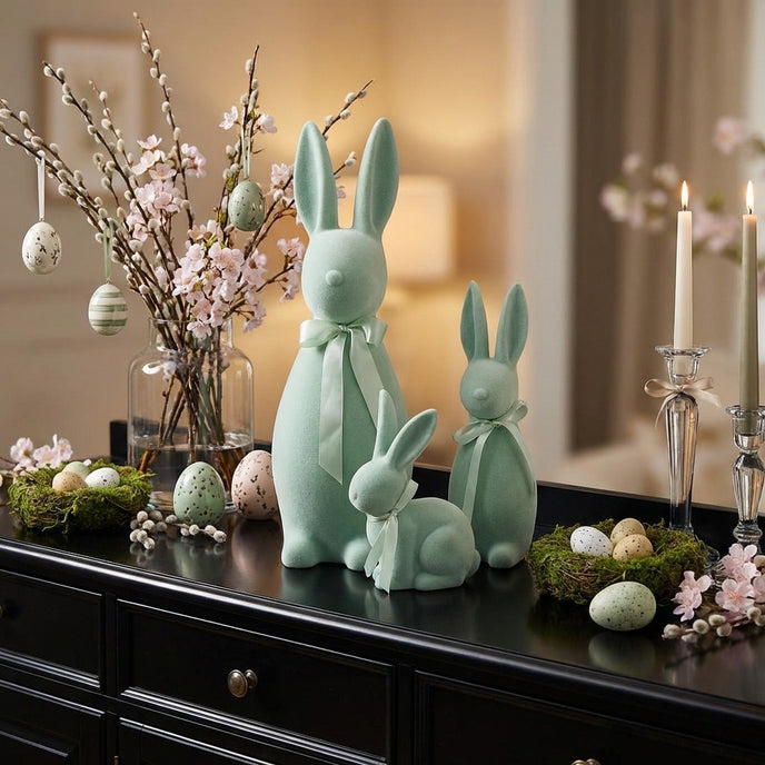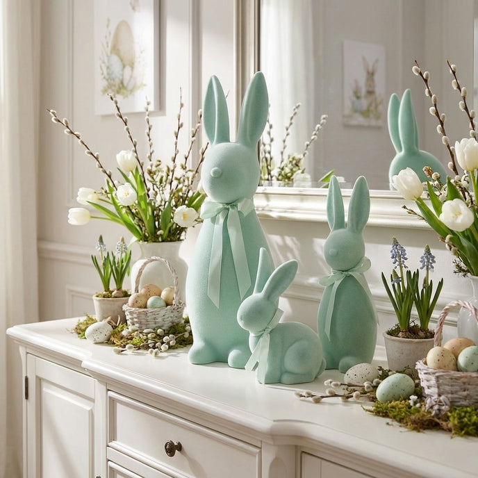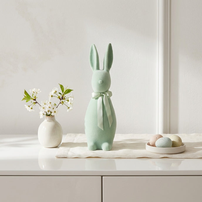 Designul său vertical de 30cm oferă eleganță și permite integrarea ușoară pe rafturi, biblioteci sau ca punct focal în aranjamentele de pe masa de Paște. Finisajul catifelat conferă figurinei o finețe extremă la atingere și un aspect vizual premium, captând lumina într-un mod delicat. Verdele mentă aduce o stare de calm și prospețime, fiind una dintre cele mai apreciate nuanțe pentru decorul modern de primăvară. Funda din satin asortată, legată discret la gât, subliniază atenția la detalii și transformă figurina într-o decorațiune gata de oferit cadou.