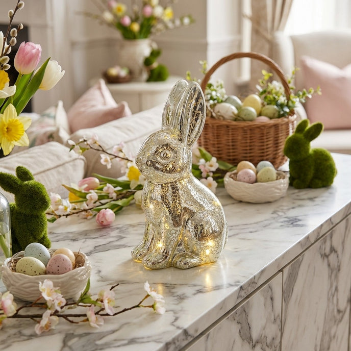 Redefinește atmosfera de sărbătoare cu iepurașul luminos din Colecția de Paște Ornament24. Această piesă exclusivistă combină farmecul cu tehnologia modernă LED, transformându-se dintr-o figurină elegantă de zi într-o lampă de veghe fascinantă pe timpul serii.