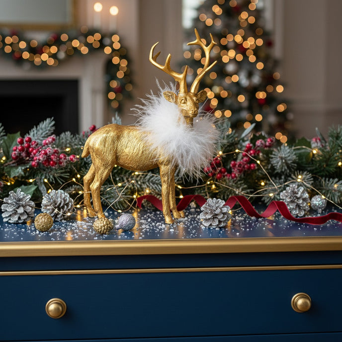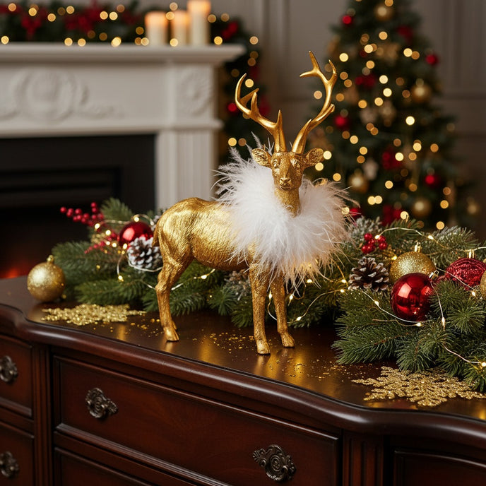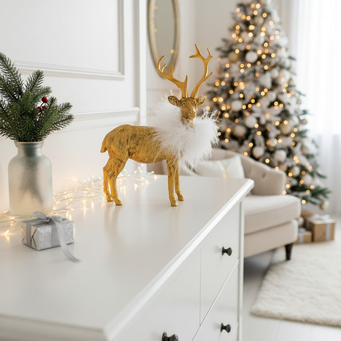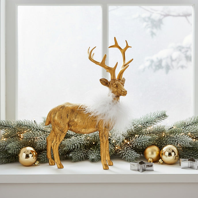 Transformă decorul de sărbători într-un colț de poveste cu acest ren decorativ auriu cu pene albe. Realizat cu atenție la detalii, renul impresionează prin finisajul auriu metalizat și gulerul decorativ din pene albe fine, care adaugă o notă luxoasă și festivă.