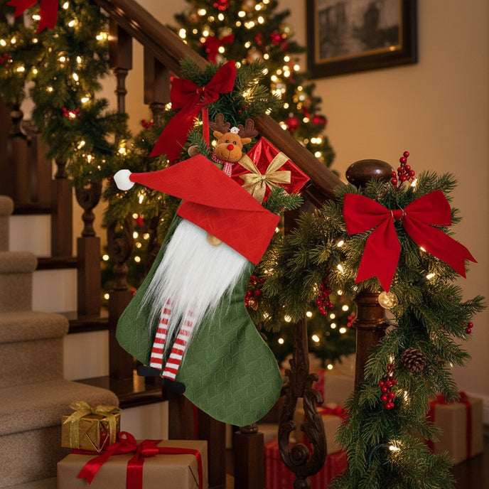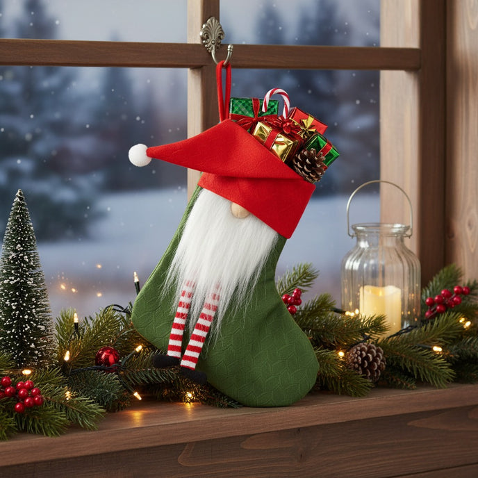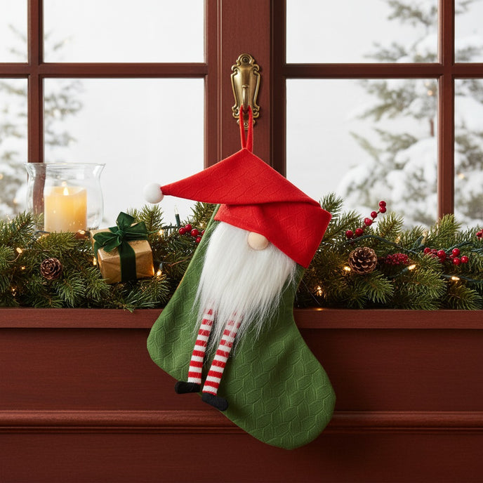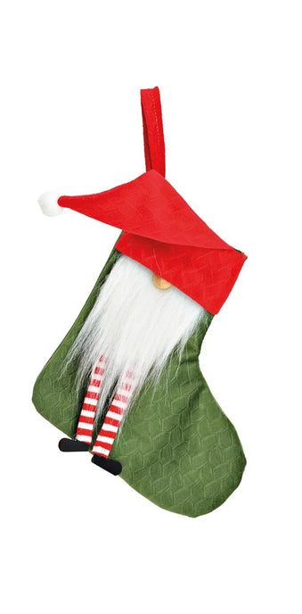 Creează un decor plin de farmec cu această șosetă decorativă de Crăciun verde cu spiriduș roșu, ideală pentru a aduce spiritul sărbătorilor în fiecare colț al casei. Designul vesel, cu spiriduș cu barbă albă, căciulă roșie și picioare dungi alb-roșu, oferă un aer scandinav modern, perfect pentru un Crăciun de poveste.